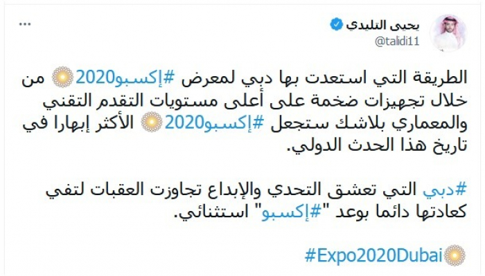 ووصف هذه الاستعدادات: "بلا شك ستجعل إكسبو 2020 الأكثر إبهارا في تاريخ هذا الحدث الدولي".