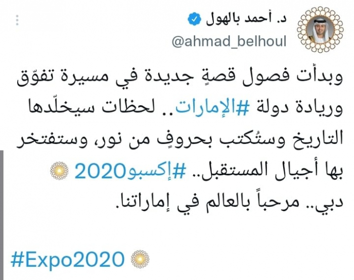 وأكد أنها: "لحظات سيخلّدها التاريخ وستُكتب بحروفٍ من نور، وستفتخر بها أجيال المستقبل"، مضيفا: "إكسبو 2020 دبي.. مرحباً بالعالم في إماراتنا".