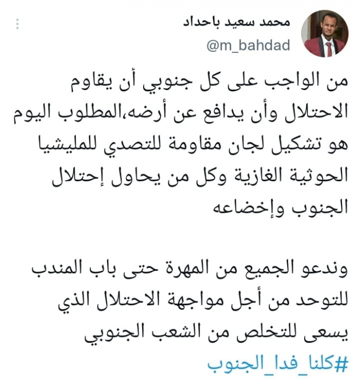 طالب الناشط السياسي محمد سعيد باحداد بمقاومة الاحتلال اليمني، والدفاع عن أرض الجنوب، والتصدي لمليشيا الحوثي الإرهابية، ومنعها من غزو أي شبر من المهرة إلى باب المندب.