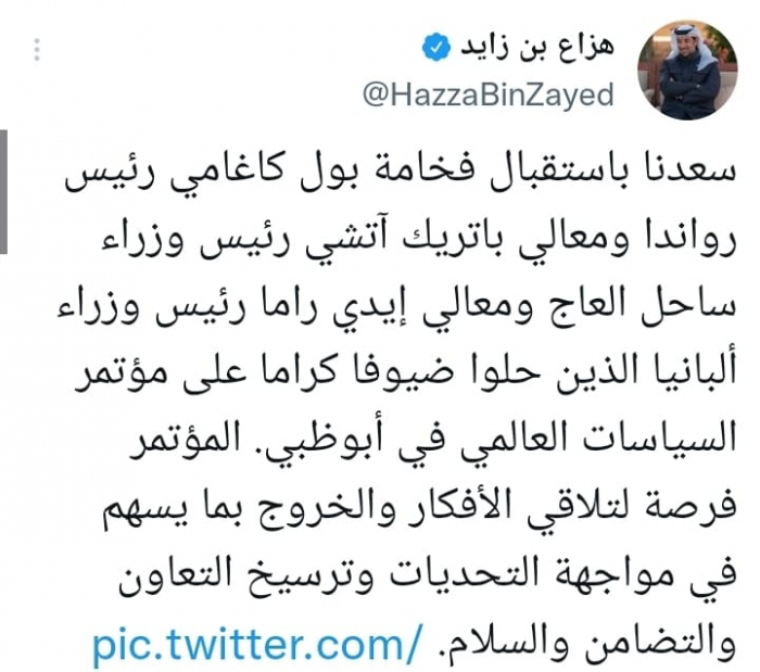 وأشار في تغريدة على حسابه بموقع التدوين المصغر تويتر، اليوم إلى أننا: "سعدنا باستقبال فخامة بول كاغامي رئيس رواندا ومعالي باتريك آتشي رئيس وزراء ساحل العاج ومعالي إيدي راما رئيس وزراء ألبانيا الذين حلوا ضيوفا كراما على مؤتمر السياسات العالمي في أبوظبي".