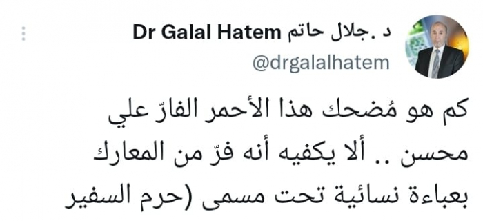 وتساءل في تغريدة على حسابه بموقع التدوين المصغر تويتر، اليوم: "كم هو مُضحك هذا الأحمر الفارّ علي محسن؟"، مضيفا: "ألا يكفيه أنه فرّ من المعارك بعباءة نسائية تحت مسمى (حرم السفير)".