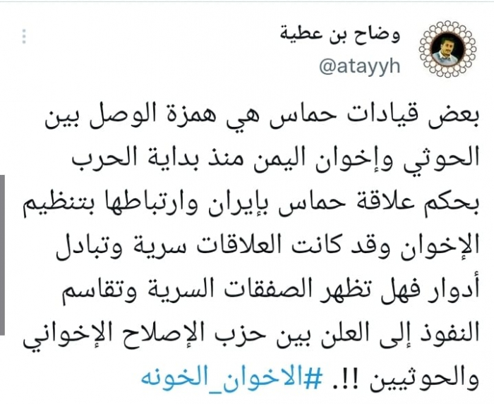 وأوضح في تغريدة على حسابه بموقع التدوين المصغر تويتر، اليوم أن: "بعض قيادات حماس هي همزة الوصل بين الحوثي وإخوان اليمن منذ بداية الحرب بحكم علاقة حماس بإيران وارتباطها بتنظيم الإخوان، وقد كانت العلاقات سرية وتبادل أدوار".
