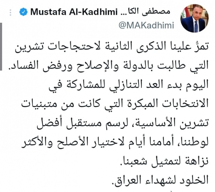 أشاد رئيس الوزراء العراقي مصطفى الكاظمي باحتجاجات تشرين في ذكراها الثانية، مطالبا العراقيين بالمشاركة في الانتخابات لاختيار الأصلح لضمان مستقبل أفضل.