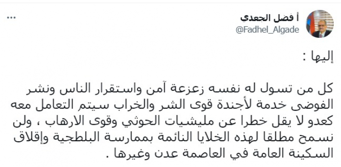 وأوضح أن خطر هؤلاء: "لا يقل خطرا عن مليشيات الحوثي وقوى الإرهاب، ولن نسمح مطلقا لهذه الخلايا النائمة بممارسة البلطجية وإقلاق السكينة العامة في العاصمة عدن وغيرها".