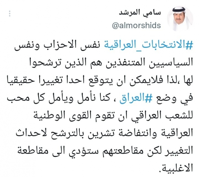 وأكد في تغريدة على حسابه بموقع التدوين المصغر تويتر، اليوم أن: "الانتخابات العراقية بها نفس الأحزاب ونفس السياسيين المتنفذين هم الذين ترشحوا لها".