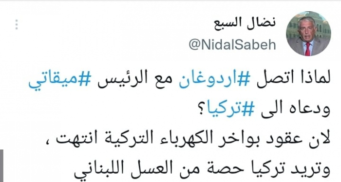 وتساءل في تغريدة على حسابه بموقع التدوين المصغر تويتر، اليوم: "لماذا اتصل أردوغان مع الرئيس ميقاتي ودعاه إلى تركيا؟" متابعا: "لأن عقود بواخر الكهرباء التركية انتهت، وتريد تركيا حصة من العسل اللبناني".