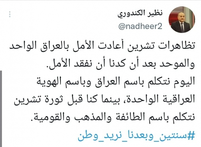 وأشار في تغريدة على حسابه بموقع التدوين المصغر تويتر، اليوم إلى أن: "تظاهرات تشرين أعادت الأمل بالعراق الواحد والموحد بعد أن كدنا أن نفقد الأمل".