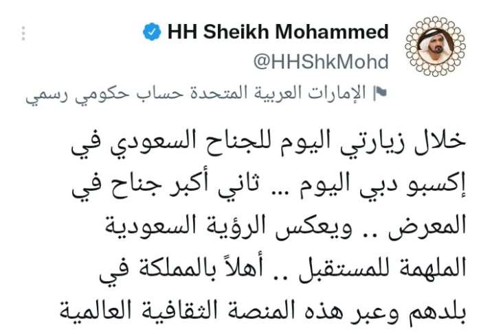 وشدد في تغريدة على حسابه بموقع التدوين المصغر تويتر، اليوم على أنه: "خلال زيارتي اليوم للجناح السعودي في إكسبو دبي اليوم، ثاني أكبر جناح في المعرض".