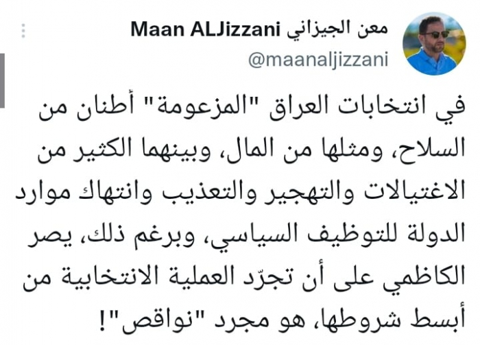 وقال في تغريدة على حسابه بموقع التدوين المصغر تويتر، اليوم إن: "في انتخابات العراق المزعومة، أطنان من السلاح، ومثلها من المال، وبينهما الكثير من الاغتيالات والتهجير والتعذيب وانتهاك موارد الدولة للتوظيف السياسي".