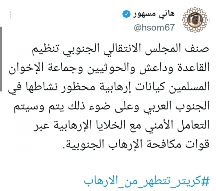 أكد الكاتب الصحفي هاني مسهور أن المجلس الانتقالي الجنوبي يصنف خلايا تنظيمات الإخوان وداعش والقاعدة ومليشيا الحوثي كيانات إرهابية، ويحظر نشاطها.