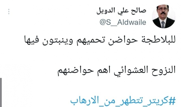 وأكد في تغريدة على حسابه بموقع التدوين المصغر تويتر، اليوم أن: "للبلاطجة حواضن تحميهم وينبتون فيها، النزوح العشوائي أهم حواضنهم"، مختتما بهاشتاج: "كريتر تتطهر من الإرهاب".