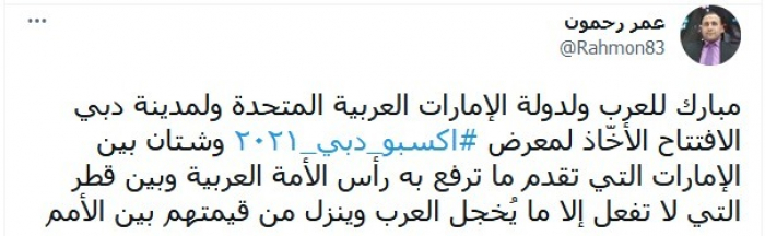 وبارك افتتاح هذا الحدث الكبير، قائلا: "مبارك للعرب ولدولة الإمارات العربية المتحدة ولمدينة دبي الافتتاح الأخّاذ لمعرض إكسبو دبي 2020".