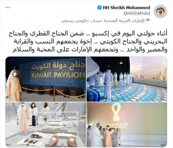 ونشر عبر حسابه على "تويتر"، اليوم، مجموعة من الصور، قائلا: "أثناء جولتي في إكسبو.. ضمن الجناح القطري والجناح البحريني والجناح الكويتي".