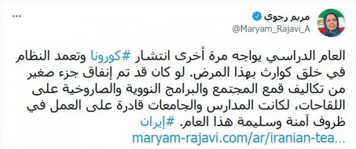 وواصلت: "لو كان قد تم إنفاق جزء صغير من تكاليف قمع المجتمع والبرامج النووية والصاروخية على اللقاحات، لكانت المدارس والجامعات قادرة على العمل في ظروف آمنة وسليمة هذا العام".