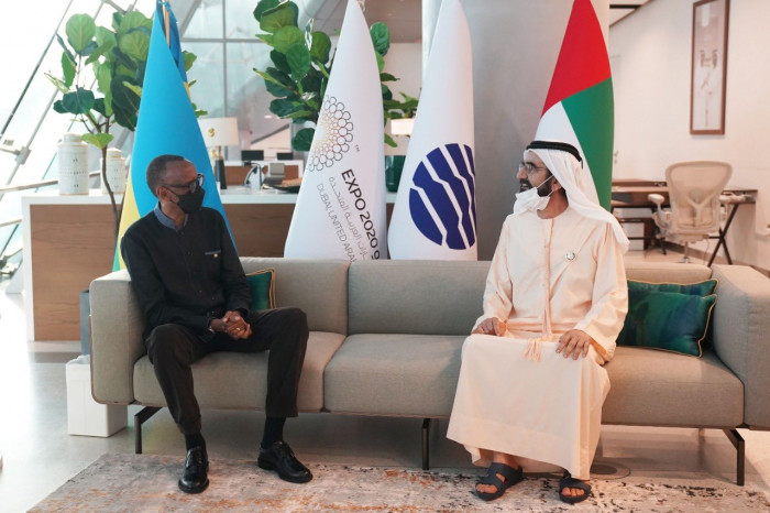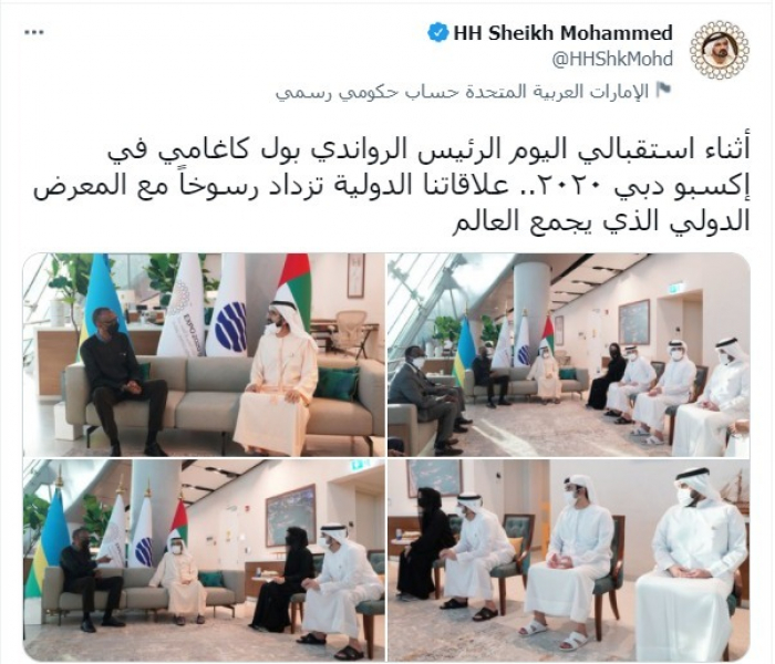 ونشر في تغريدة عبر تويتر"، اليوم، صورا من لقاء الرئيس الرواندي، قائلا: "أثناء استقبالي اليوم الرئيس الرواندي بول كاغامي في إكسبو دبي 2020".