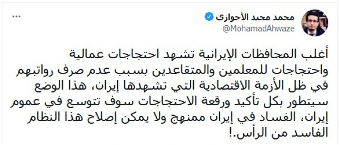 وقال في تغريدة عبر "تويتر"، اليوم، إن "أغلب المحافظات الإيرانية تشهد احتجاجات عمالية واحتجاجات للمعلمين والمتقاعدين".