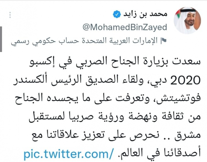 وقال في تغريدة على حسابه بموقع التدوين المصغر تويتر، اليوم إننا: "سعدت بزيارة الجناح الصربي في إكسبو 2020 دبي، ولقاء الصديق الرئيس ألكسندر فوتشيتش".