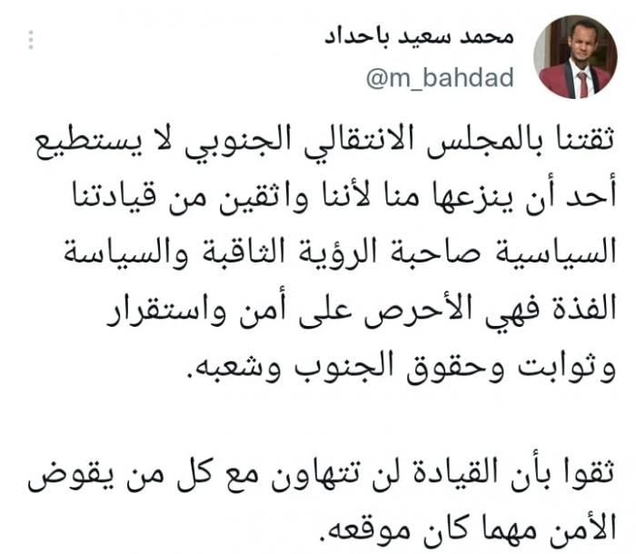 باحداد: ثقتنا ثابتة بـ الانتقالي وحرص قيادته على أمن الجنوب