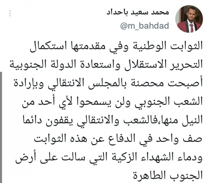 باحداد عن الانتقالي: يحصن ثوابت شعب الجنوب وقضيته