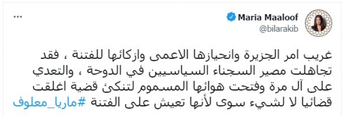 استنكرت الإعلامية اللبنانية ماريا معلوف، سياسات قناة الجزيرة القطرية، بتجاهلها مصير السجناء السياسيين في الدوحة، والتركيز على قضايا تحاول من خلالها إثارة الفتنة.