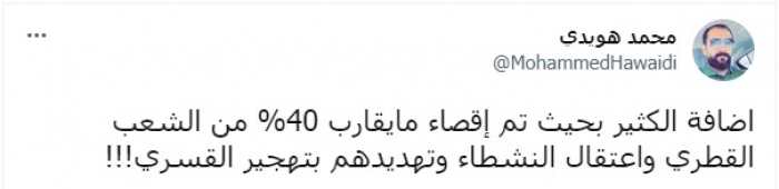 وكتب بسخرية: "إضافة الكثير بحيث تم إقصاء ما يقارب 40% من الشعب القطري واعتقال النشطاء وتهديدهم بالتهجير القسري".