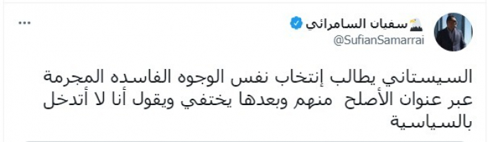 وأوضح في تغريدة عبر "تويتر"، اليوم، أن: "السيستاني يطالب بانتخاب نفس الوجوه الفاسدة المجرمة عبر عنوان الأصلح منهم، وبعدها يختفي ويقول أنا لا أتدخل بالسياسة".