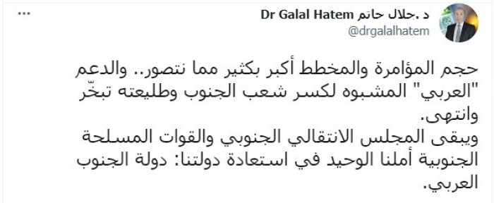 وأوضح في تغريدة عبر "تويتر"، اليوم، أن: "حجم المؤامرة والمخطط أكبر بكثير مما نتصور.. والدعم المشبوه لكسر شعب الجنوب وطليعته تبخّر وانتهى".