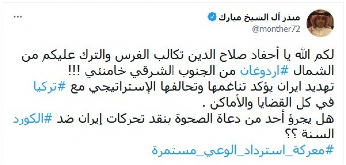 وكتب في تغريدة عبر "تويتر"، اليوم: "لكم الله يا أحفاد صلاح الدين تكالب الفرس والترك عليكم.. من الشمال أردوغان ومن الجنوب الشرقي خامنئي".