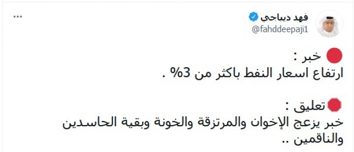 وأشار في تغريدة عبر "تويتر"، اليوم، إلى "ارتفاع أسعار النفط بأكثر من 3%"، معلقا: "خبر يزعج الإخوان والمرتزقة والخونة وبقية الحاسدين والناقمين".