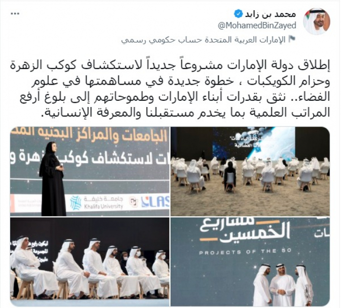 أكد الشيخ محمد بن زايد، ولي عهد أبو ظبي، نائب القائد الأعلى للقوات المسلحة الإماراتية، ثقته في طموحات أبناء الإمارات، تزامنا مع إطلاق الإمارات مشروع جديد في مجال الفضاء.