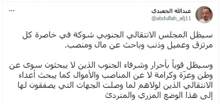 الجعيدي: الانتقالي الجنوبي سيظل شوكة أمام المرتزقة