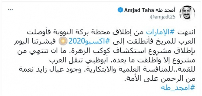 وأشار في تغريدة عبر "تويتر"، اليوم، إلى تلك المشروعات: "انتهت الإمارات من إطلاق محطة بركة النووية، فأوصلت العرب للمريخ، فانطلقت إلى إكسبو 2020، فبشرتنا اليوم بإطلاق مشروع استكشاف كوكب الزهرة".