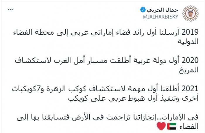 الحربي: الإمارات تسابق بإنجازاتها نحو الفضاء