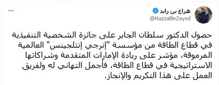 وأوضح أن: "حصول الدكتور سلطان الجابر على الجائزة من مؤسسة إنرجي إنتلجينس العالمية، مؤشر على ريادة الإمارات المتقدمة وشراكاتها الاستراتيجية في قطاع الطاقة".