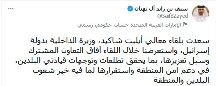 التقى الشيخ سيف بن زايد آل نهيان، نائب رئيس مجلس الوزراء وزير الداخلية الإماراتي، اليوم، أيليت شاكيد، وزير الداخلية الإسرائيلية.