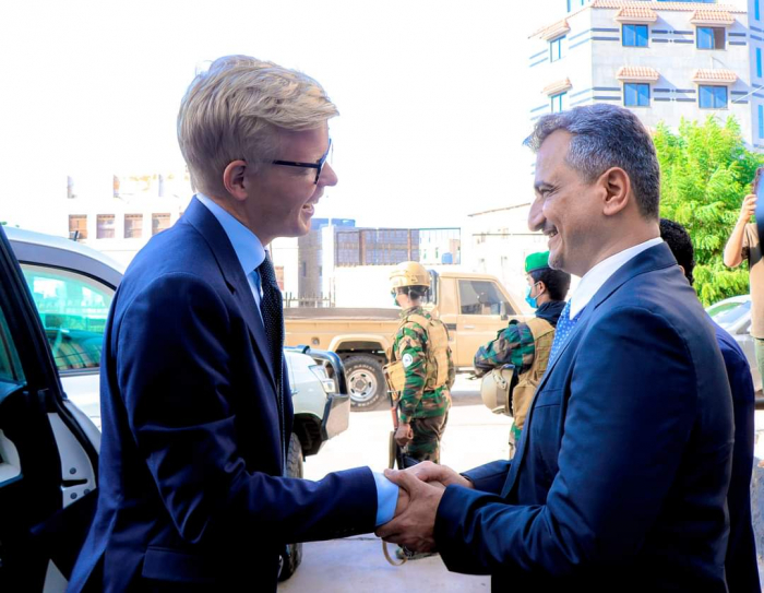رحب أحمد حامد لملس محافظ العاصمة عدن، اليوم الثلاثاء، بالمبعوث الأممي لليمن، هانز جروندبرج، خلال زيارته العاصمة عدن.