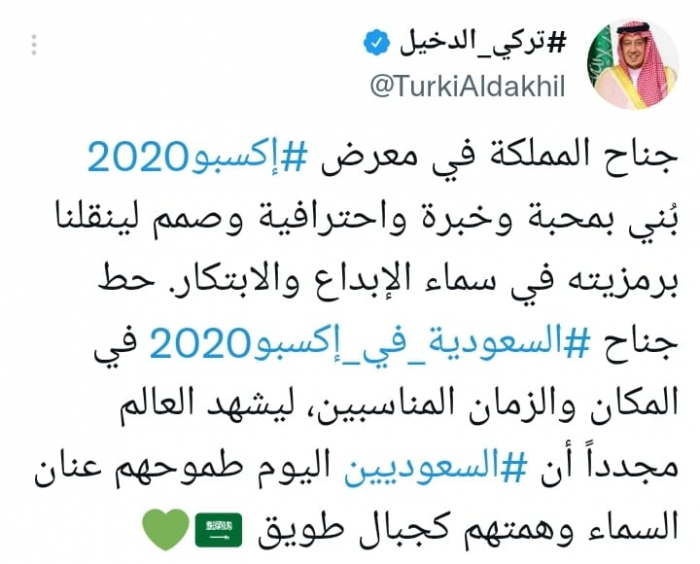 وشدد في تغريدة على حسابه بموقع التدوين المصغر تويتر، اليوم على أن: "جناح المملكة في معرض إكسبو 2020 بُني بمحبة وخبرة واحترافية وصمم لينقلنا برمزيته في سماء الإبداع والابتكار".