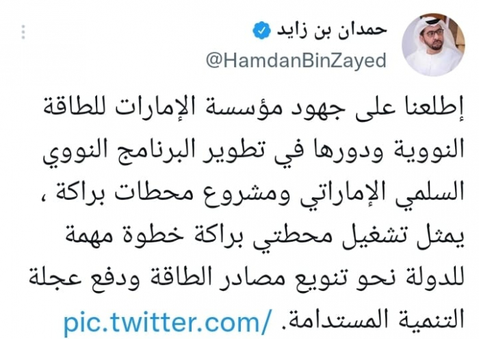 وقال في تغريدة على حسابه بموقع التدوين المصغر تويتر، اليوم أن: "اطلعنا على جهود مؤسسة الإمارات للطاقة النووية ودورها في تطوير البرنامج النووي السلمي الإماراتي ومشروع محطات براكة".