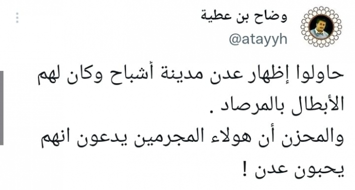 ورأى في تغريدة على حسابه بموقع التدوين المصغر تويتر، اليوم أنهم: "حاولوا إظهار عدن مدينة أشباح وكان لهم الأبطال بالمرصاد"، مستطردا: "المحزن أن هؤلاء المجرمين يدعون أنهم يحبون عدن".