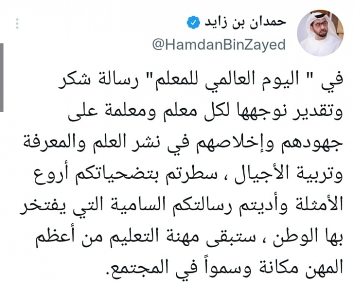 هنأ الشيخ حمدان بن زايد آل نهيان، ممثل حاكم أبوظبي في منطقة الظفرة، المعلمين في دولة الإمارات باليوم العالمي للمعلم.