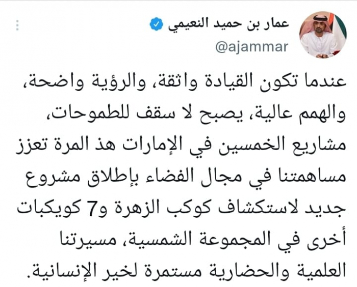 واعتبر أن: "مشاريع الخمسين في الإمارات هذ المرة تعزز مساهمتنا في مجال الفضاء بإطلاق مشروع جديد لاستكشاف كوكب الزهرة و7 كويكبات أخرى في المجموعة الشمسية"، مؤكدا أن: "مسيرتنا العلمية والحضارية مستمرة لخير الإنسانية".
