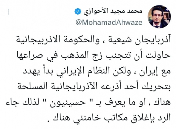 ورأى في تغريدة على حسابه بموقع التدوين المصغر تويتر، اليوم أن: "أذربايجان شيعية ، والحكومة الأذربيجانية حاولت أن تتجنب زج المذهب في صراعها مع إيران".