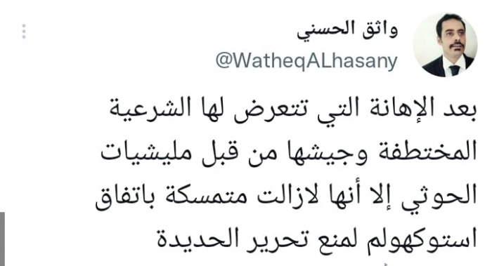 وأشار في تغريدة على حسابه بموقع التدوين المصغر تويتر، اليوم إلى أنه: "بعد الإهانة التي تتعرض لها الشرعية المختطفة وجيشها من قبل مليشيات الحوثي إلا أنها لازالت متمسكة باتفاق ستوكهولم لمنع تحرير الحديدة".