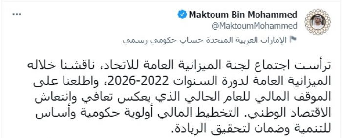 كشف الشيخ مكتوم بن محمد بن راشد، نائب رئيس الوزراء وزير المالية الإماراتي، تفاصيل اجتماع لجنة الميزانية العامة للاتحاد.