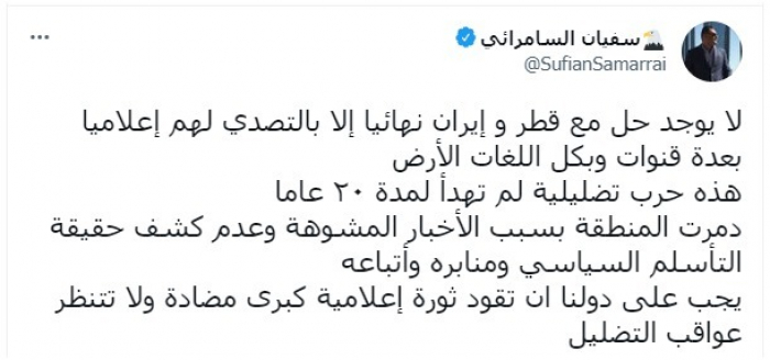 طالب الإعلامي العراقي سفيان السامرائي، الدول العربية، بثورة إعلامية ضد النظام القطري، كونها الطريق الوحيد لمواجهة الأخبار المضللة التي دمرت المنطقة.
