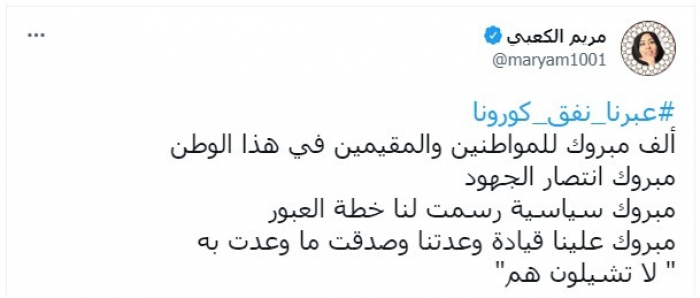 وباركت للإماراتيين هذا الانتصار، قائلة: "عبرنا نفق كورونا.. ألف مبروك للمواطنين والمقيمين في هذا الوطن".