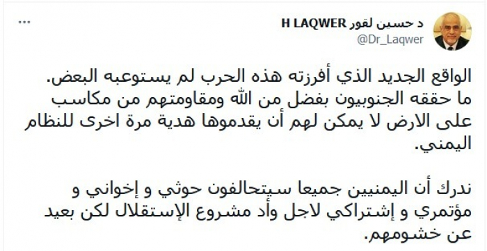 قال الناشط السياسي الدكتور حسين لقور، إن شعب الجنوب حقق مكاسب كبيرة لن يتخلى عنها مهما خططت قوى الشر اليمنية لمؤامرات لوأد حقوق الجنوبيين المشروعة في إقامة دولتهم المستقلة.
