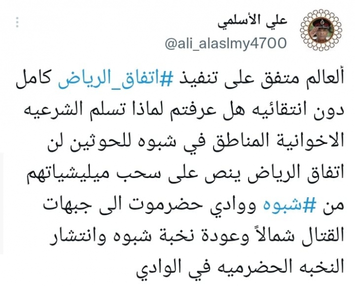الأسلمي: الشرعية تتهرب من اتفاق الرياض بتسليم شبوة للحوثيين