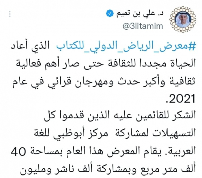 وأوضح في تغريدة على حسابه بموقع التدوين المصغر تويتر، اليوم أن: " معرض الرياض الدولي للكتاب الذي أعاد الحياة مجددا للثقافة حتى صار أهم فعالية ثقافية وأكبر حدث ومهرجان قرائي في عام 2021".