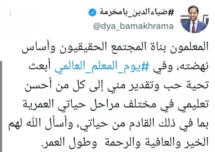 واستطرد: "في يوم المعلم العالمي أبعث تحية حب وتقدير مني إلى كل من أحسن تعليمي في مختلف مراحل حياتي العمرية بما في ذلك القادم من حياتي"، مضيفا: "أسأل الله لهم الخير والعافية والرحمة وطول العمر".